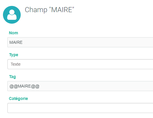 Ajouter le champ, le type (texte ou numérique) et le tag toujours entouré de @@NOM@@ et sans accent ni caractère spécial.