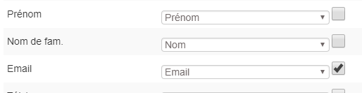Dans cet exemple on fait coïncider Prénom – Nom et E-mail avec les champs du tableau CSV.
